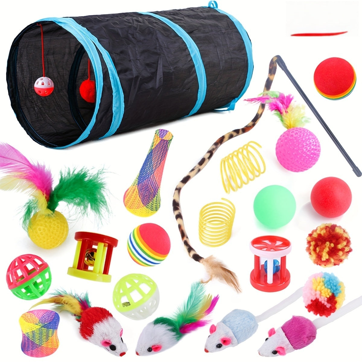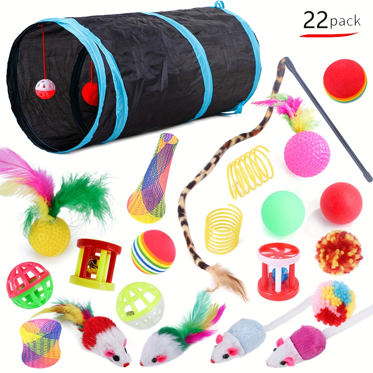 22pcs Cat Combination Tunnel Cat Play Tunnel Mouse Bell Artificial Polyester Fibre Feather Toy Cat Teaser Stick Combination Set