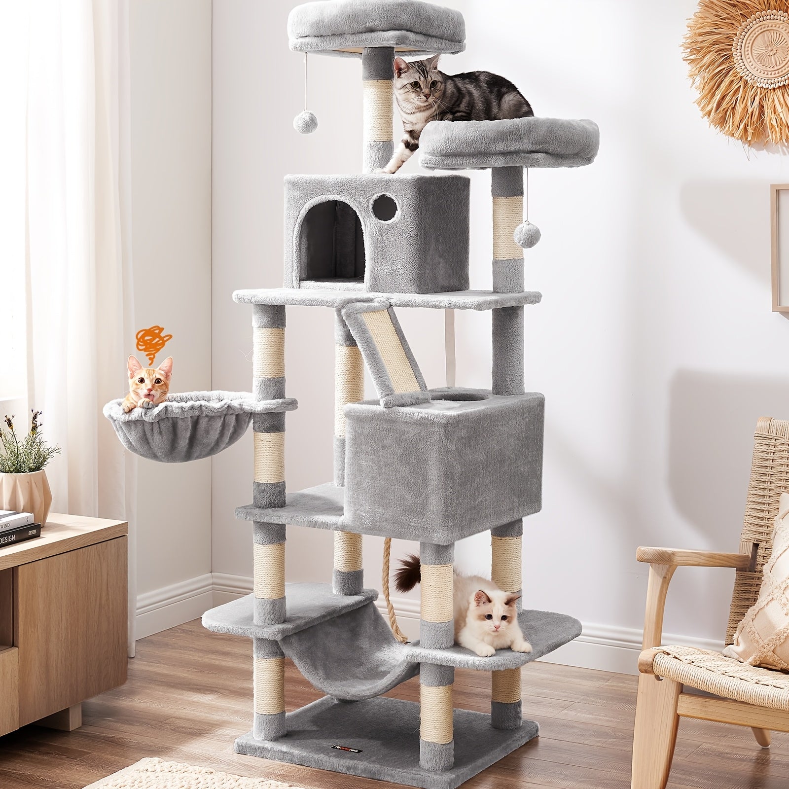 168 cm Large Cat Tower with 13 Scratching Posts, 1 Scratching Ramp, 2 Perches, 2 Caves, Basket, Hammock, Pompoms, Multi-Level Plush Cat Condo for Indoor Cats